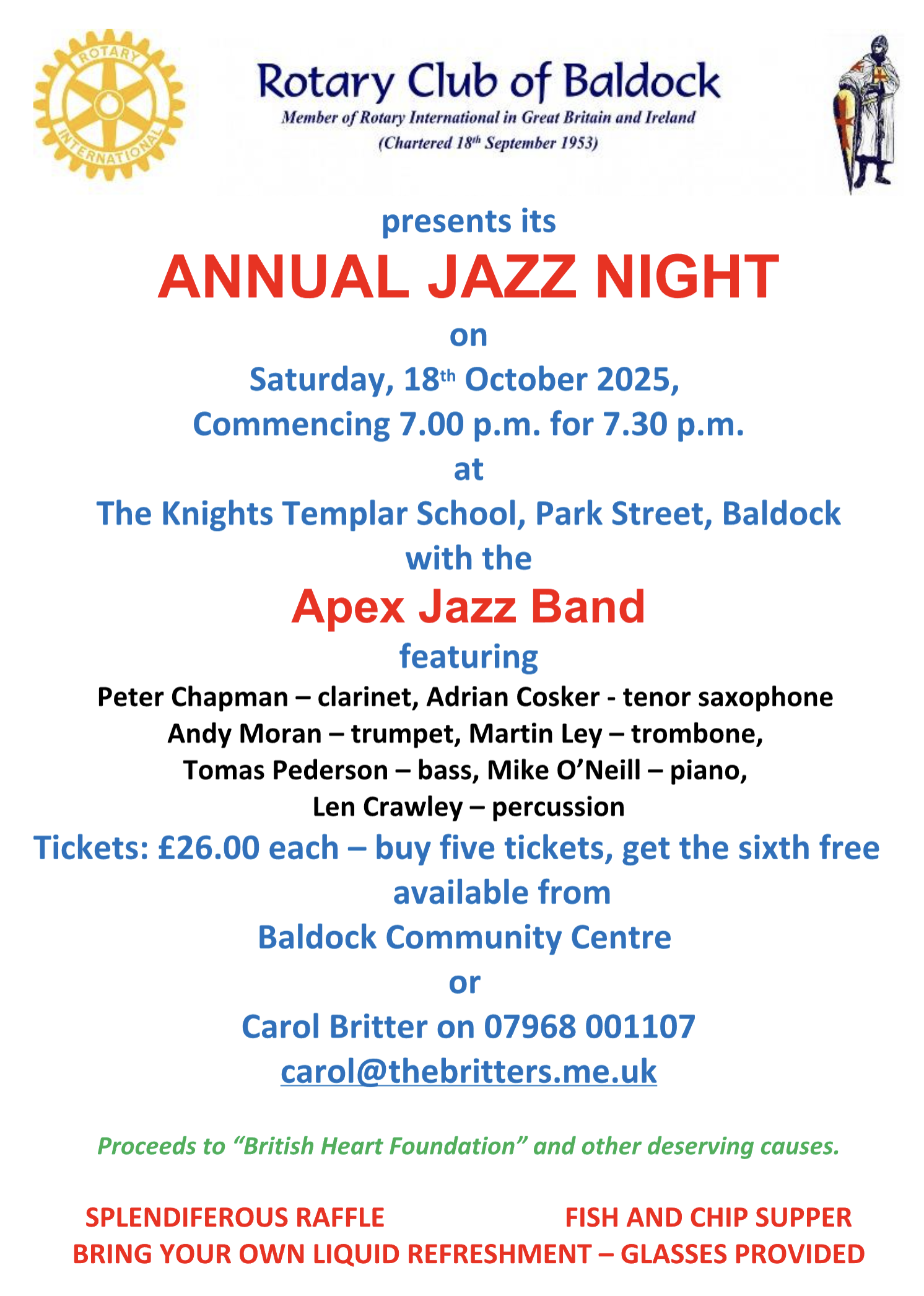 The band will be performing at the Knights Templar School Annual Jazz Concert Baldock Rotary Club Charity Event.